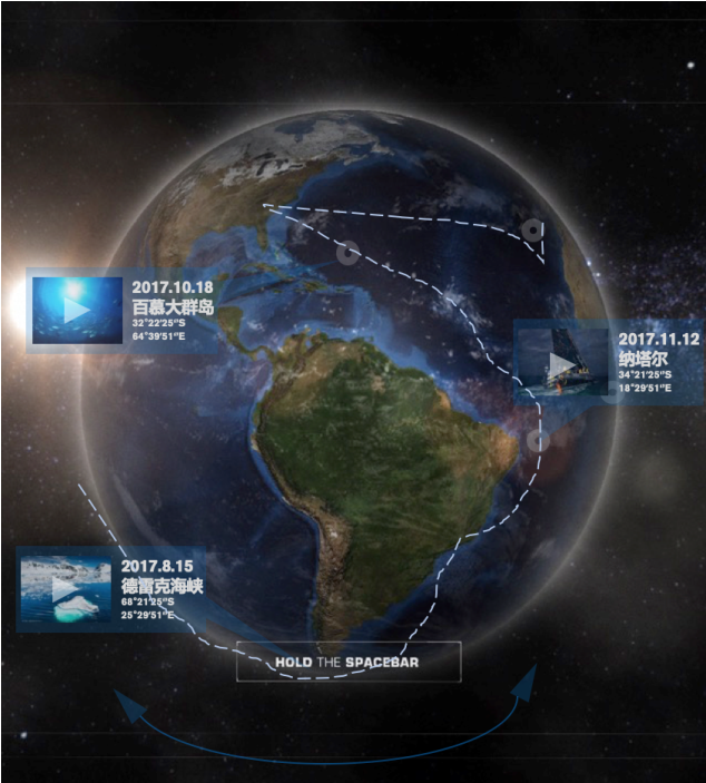 用户扫描二维码点击链接方式观看H5,H5以全景地球作为背景,转动地球的同时,可通过点击赛事每一站观看沃尔沃环球帆船赛航线上的瞬间,并了解香港站的相关赛事信息。
