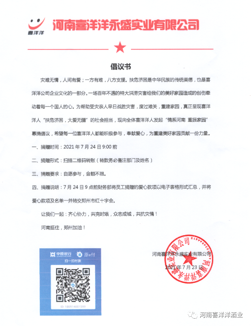 八方驰援暖人心,勠力同心渡难关!喜洋洋公司作为一家有社会责任感的企业,多年来倡导扶危济困,致力公益事业,传递社会正能量,为构建和谐社会贡献自己的一份力,在社会需要之时充当温暖守护者,用积极的行动向社会传递“中国温度”。河南挺住!郑州加油!