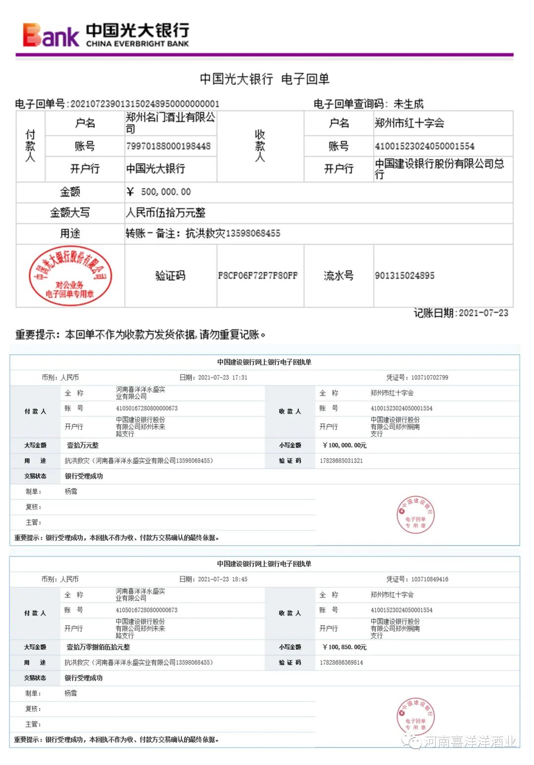 7月23日上午,公司复工后第一时间组织员工筹集车辆、食品、牛奶和饮用水等紧缺物品,积极为郑州市受灾群众提供力所能及的援助。23日下午,经公司董事会研究,向郑州市红十字会现金捐款60万元用于本次抗洪救灾。同时,公司内部发布“情系河南,重振家园”的倡议书,号召各分公司、事业部全体员工积极为抗洪救灾、重建美好家园做出一份贡献。截止7月23日18:45分,我公司累计向郑州市红十字会捐赠救灾款项 70.085万元(员工捐款仍在持续进行中...),为经受洪涝灾害的父老乡亲和灾后重建工作贡献一份绵薄之力。